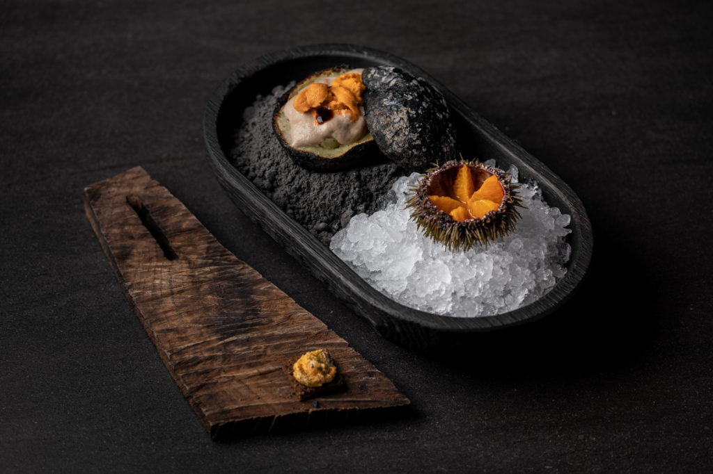 Sea urchin caviar, potatoes, tangerines and sea water