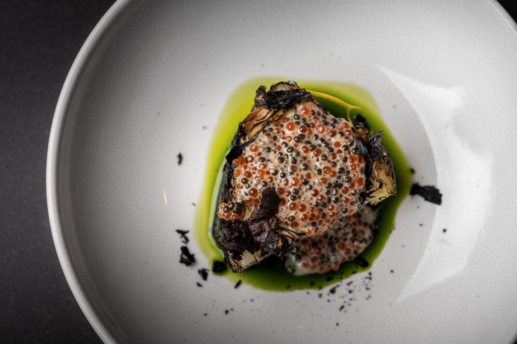 VM: Ah, there’s a special story attached to that dish. One day a supplier delivered cabbages to our restaurant. She was almost in tears. The cabbages had been out in the cold too long and were frozen when she delivered them. She felt sad, especially as her products are of very high quality. Throwing good ingredients away is not part of my nature, so I started to think about a way to save them. I burned some of the cabbages for a couple of hours in the Russian oven until they were totally black on the outside. When we finally tasted them, the flavour wasn’t like any other cabbage we had tasted before. I yelled to my team: ‘look at this you guys, it’s amazing!’ In the restaurant we serve the burned cabbage accompanied by a sauce consisting of three types of caviar (sturgeon, salmon and pike) and a dash of reduced champagne and scallop broth. It looks creamy but no dairy products are used. With the ‘Poor vs Rich’ dish I wanted to prove that the cheapest and most abundant products in Russia, such as cabbage, can be as tasty as the most expensive ingredients. Vegetables are definitely my favourite products to work with.