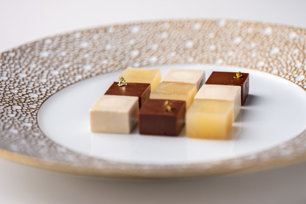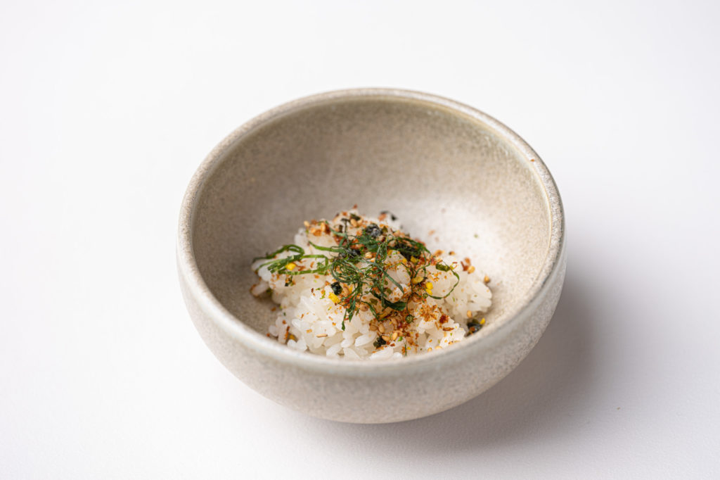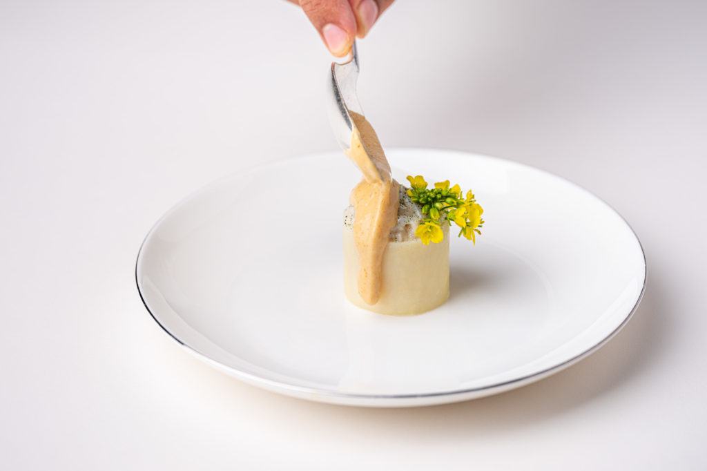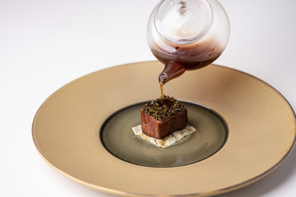 Chefs Dennis and Jurgen present us a sirloin Wagyu A5 ‘Gunma Prefecture’ with Chinese Imperial caviar, furikake and black fermented garlic dashi. This is served with a bowl of rice, finished with the jus. Through the simplicity of this dish, the chefs evince their respect for high-quality products.