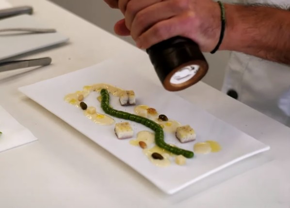 2. Strain the pesto balls from the alginate bath and deposit them in a row in a long, narrow mould with a half-round shape of 0.3 cm wide. In this way, we will form a long and narrow “worm”, formed by 20 pesto balls in a row.